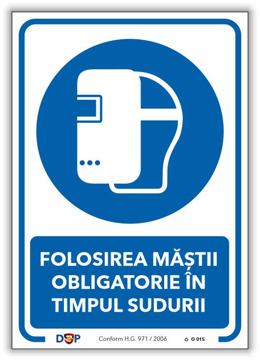 HALAT OBLIGATORIU BONETĂ CAPUL FOLOSIREA MĂȘTII PROTECȚIA OBLIGATORIE ÎN OBLIGATORIE PENTRU TIMPUL SUDURII LUCRUL LA ÎNĂLȚIME – indicator Obligativitate pentru semnalizare la locul de muncă.