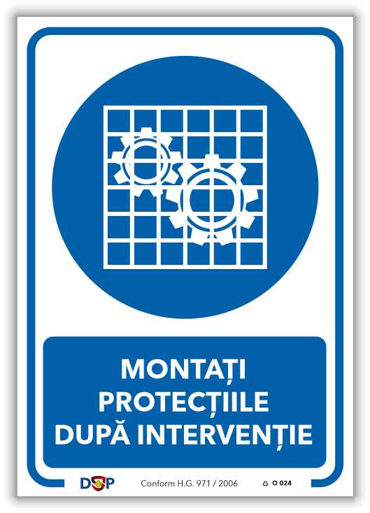 MONTAȚI PROTECȚIILE DUPĂ INTERVENȚIE – indicator Obligativitate pentru semnalizare la locul de muncă.