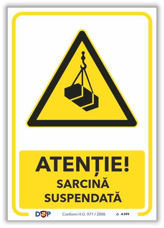 PERICOL MAL INSTABIL DE SURPARE SARCINĂ ZONĂ DE LUCRU SUSPENDATĂ MACARALEI – indicator Avertizare pentru semnalizare la locul de muncă.