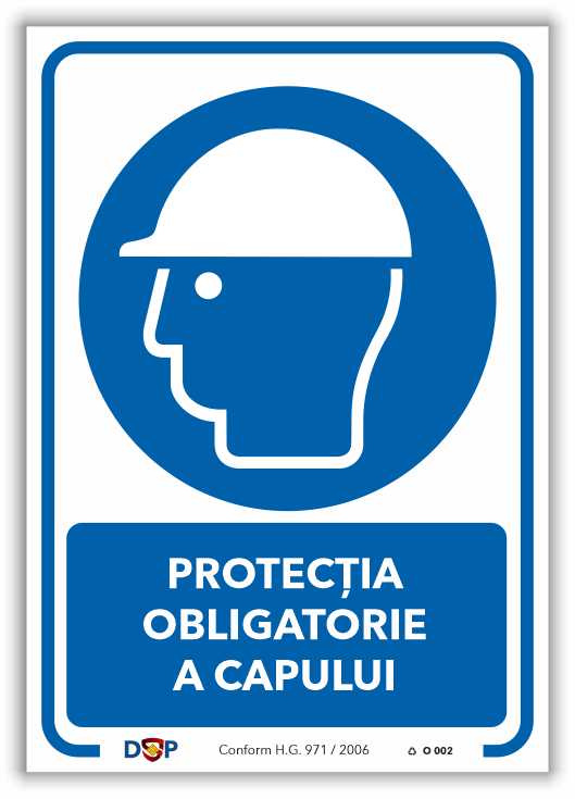 PROTECȚIA LUCRAȚI NUMAI OBLIGATORIE CU CASCĂ CAPULUI DE PROTECȚIE – indicator Obligativitate pentru semnalizare la locul de muncă.