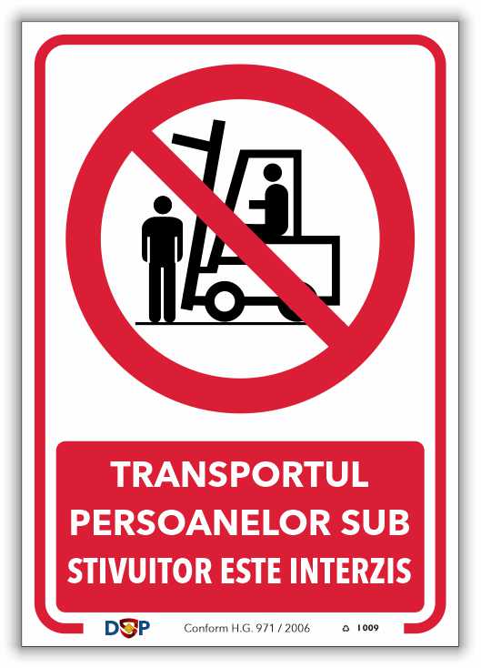 TRANSPORTUL TRANSPORTUL PERSOANELOR SUB PERSOANELOR STIVUITOR ESTE INTERZIS STIVUITOR ESTE INTERZIS – indicator Interzicere pentru semnalizare la locul de muncă.